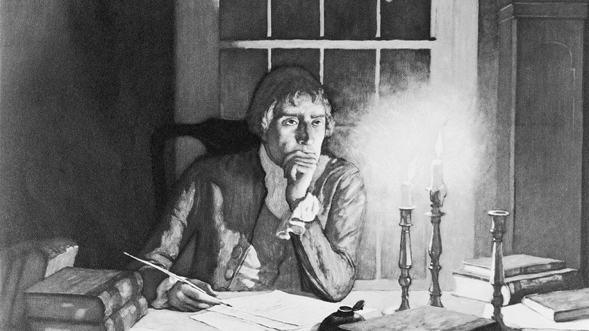Thomas Jefferson (1743–1826) was born at his father’s plantation in Albemarle County, Virginia. Peter Jefferson was a wealthy surveyor, and his wife, Jane, was of the aristocratic Randolph family. Thomas’s father died in 1757, when he was 14, and his mother died in 1776, when he was 33, just before the Declaration of Independence was published. Though Jefferson left no detailed account of these losses, it’s fair to surmise that his relationship with both parents was strong, inheriting as he did the grace and elegance of his mother and the numerological and literary interests of his father, who bequeathed him, as he said, “my books, my mathematical instruments, and my cherry-tree desk and bookcase.” Among them were several volumes of The Tatler and The Spectator, Addison and Steele being favorite authors of the colonists. If Jefferson grew up to take an interest in many different things—science, architecture, government, literature, music, and horticulture among them—he was always a confirmed bibliophile.