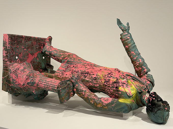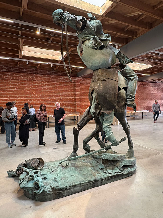 On the other side of the country, woke iconoclasm has found its ne plus ultra in a Los Angeles exhibition, entitled MONUMENTS, of ten banished commemorative artworks and the responses they’ve inspired from contemporary African-American artists. The strongest impression likely to be made on the unindoctrinated who visit this show—housed at two different venues, the Museum of Contemporary Art’s Geffen Contemporary and The Brick, and bankrolled by the Mellon, MacArthur, and Ford Foundations and other deep-pocketed donors—is the inconsequentiality of the contemporary productions compared with the “decommissioned” Confederate monuments. Those that have not been destroyed, that is. Displayed without their pedestals and still paint-splattered, the figurative bronze sculptures are worthy productions by the academic standards of their era. As its pièce de résistance, the exhibition offers a contemporary artist’s mangling of the extraordinarily fine Stonewall Jackson equestrian that stood for a century in a park alongside the county courthouse in Charlottesville, Virginia.