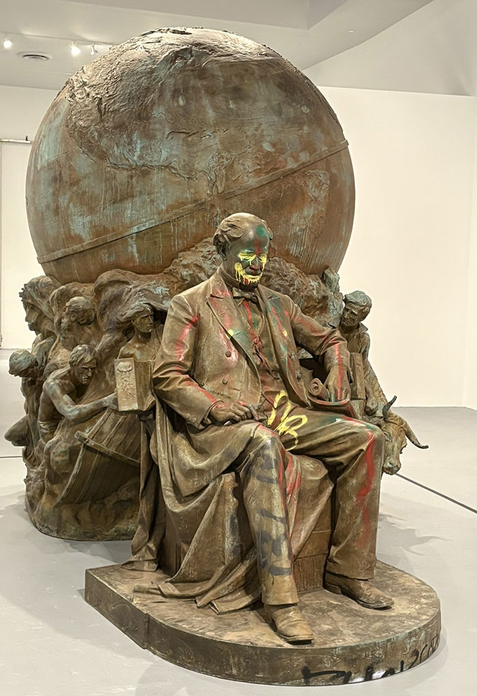 A vandalized Jefferson Davis figure, from the bombastically elaborate Monument Avenue tribute to the Confederate president, is also exhibited. He lies flat on his back, with his head stoved in, one leg stained with urine, and the remnant of a Kleenex noose around his neck. The draped, idealized, and undamaged “Miss Confederacy” figure that loomed high above him stands in another chamber, weirdly lit and set against reflective black panels, with a CCTV surveillance camera pointing down at her. Another “decommissioned” Monument Avenue work is the Matthew Fontaine Maury Monument, with the internationally renowned author of the treatise considered the first masterwork of modern oceanography, The Physical Geography of the Sea (1855), seated in mufti, clasping a compass with one hand and charts with the other. Around the large globe behind him (which was formerly perched on a tall base) the forces of nature—storms and floods—buffet men, women, and domesticated animals. Maury served the Southern cause by developing a mine that proved highly effective against federal vessels. Along with Hunter McGuire—likewise portrayed in mufti at Capitol Square despite his service as a Confederate army surgeon—Maury was an eminent man of science who held benighted racial views. Biographical markers putting the two of them in historical context would be far preferable to their monuments’ removal, which only serves to dumb down the public realm.