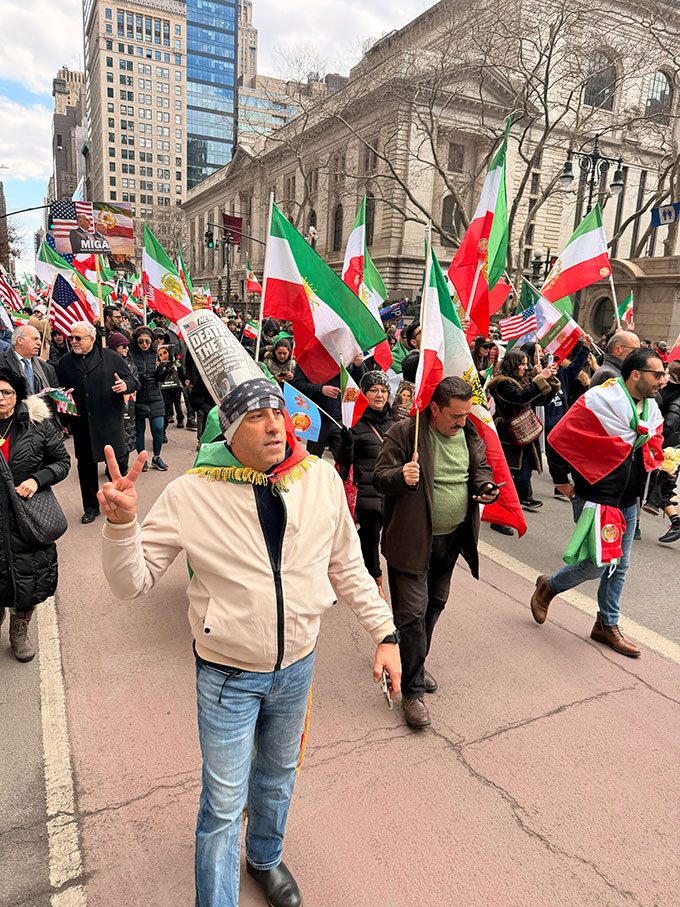 As the marchers stepped off toward Times Square, secured by repeatedly thanked NYPD members, Second Avenue saw a stream of American, Israeli, and pre-revolutionary “Lion and Sun” Iranian flags.