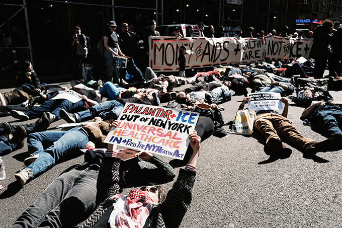 Clearly, the word is spreading: Palantir is the new bête noire of far-left activists. Jewish Voice for Peace recently mobilized in the lobby of Palantir’s New York City office alongside the Sunrise Movement and Jews for Racial and Economic Justice, as part of the latter’s annual Seder in the Streets direct action. The militant AIDS activist group ACT UP New York even staged a “die-in” outside Palantir’s office in the city, arguing that funding the war with Iran diverts resources away from HIV programs.